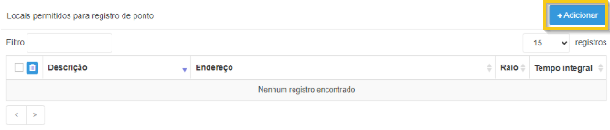 Agora, em “Endereços permitidos para registro do ponto”, será exibido o endereço autorizado para que o funcionário realize o registro do ponto, contendo as informações de Descrição, Endereço e Raio, conforme a seguir: