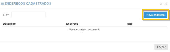 Em “Endereços cadastrados” serão exibidos todos os endereços previamente registrados. Para adicionar um novo endereço, clique em “Novo Endereço”, conforme ilustrado abaixo: