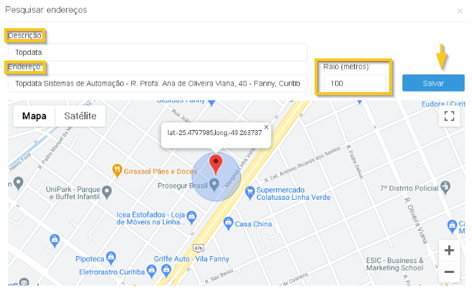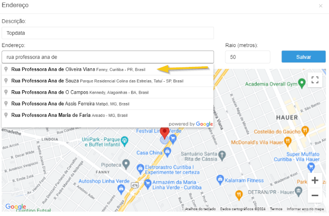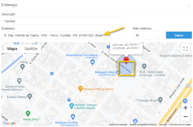 - Endereço: Campo de pesquisa para localizar o endereço por nome da rua ou local.