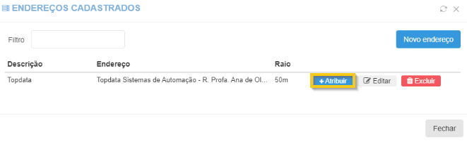 Ao salvar o endereço, ele será incluído na lista de “Endereços cadastrados”. Para associar esse endereço ao funcionário, clique em “+ Atribuir”, conforme demonstrado nos exemplos a seguir: