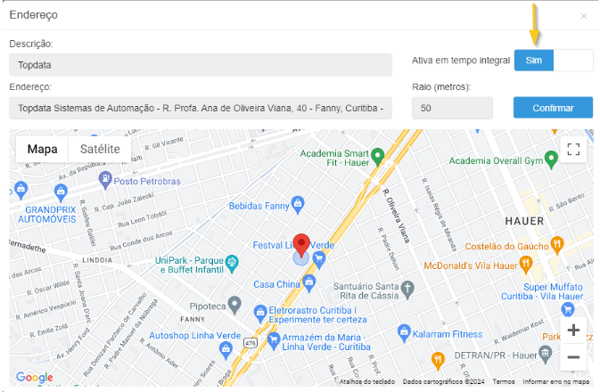 Por padrão ao atribuir o endereço na cerca virtual, o tempo integral vem sempre habilitado.