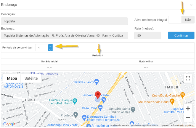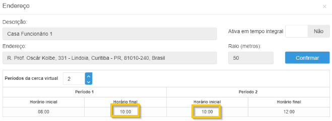 É possível cadastrar até 10 períodos por endereço. Após definir a quantidade de períodos, informe o horário de início e término em que a cerca virtual estará ativa para cada endereço e clique em “Confirmar”.