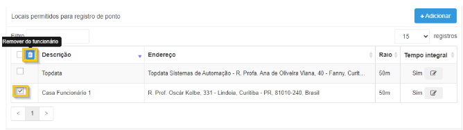 Para remover um endereço do cadastro do funcionário basta selecionar o endereço e clicar em