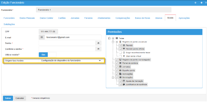 - Utilizar fuso horário: Define o fuso horário que será utilizado para o registro de ponto do funcionário.