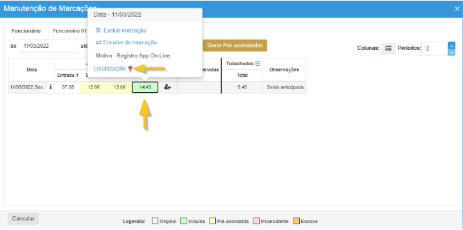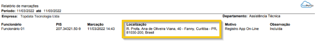 Ao clicar no registro, será apresentada a data e hora da marcação como também o local que o funcionário efetuou o registro.