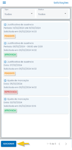 - Solicitações/Ajuste de marcação: Permite adicionar e visualizar solicitações de ajuste de marcação.