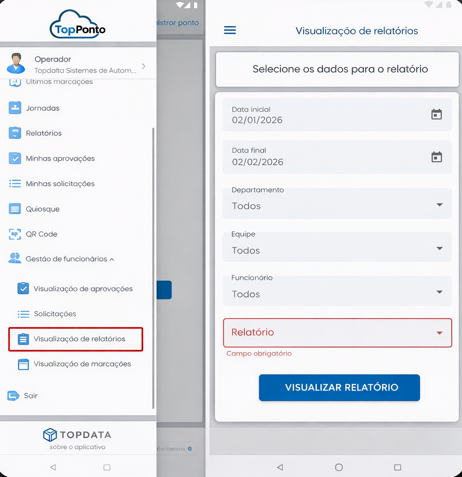 Após habilitada a permissão no App TopPonto fica disponível a emissão dos relatórios: