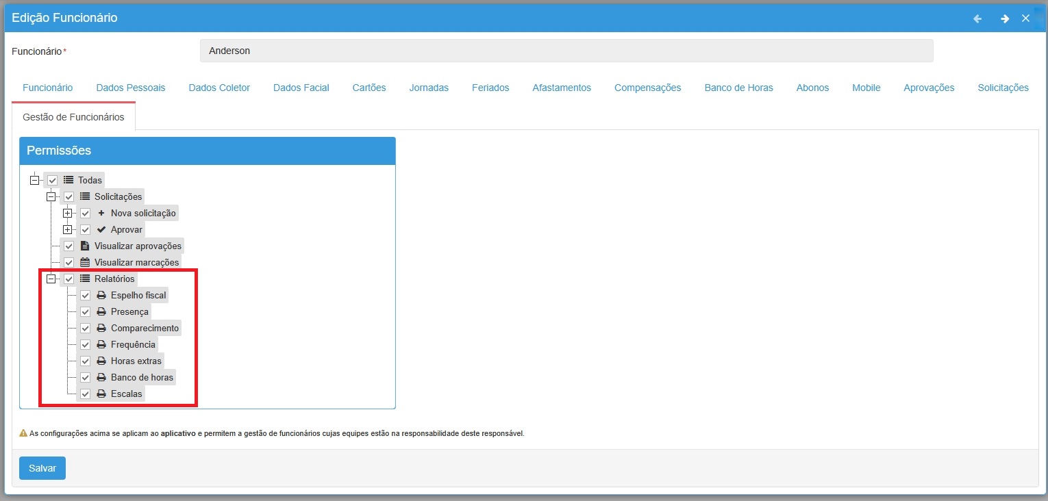 Sim, é possível, o gestor consegue emitir relatórios dos funcionários no qual ele é responsável. Para isso, basta que seja habilitada a permissão para visualização dos relatórios e quais terá acesso: