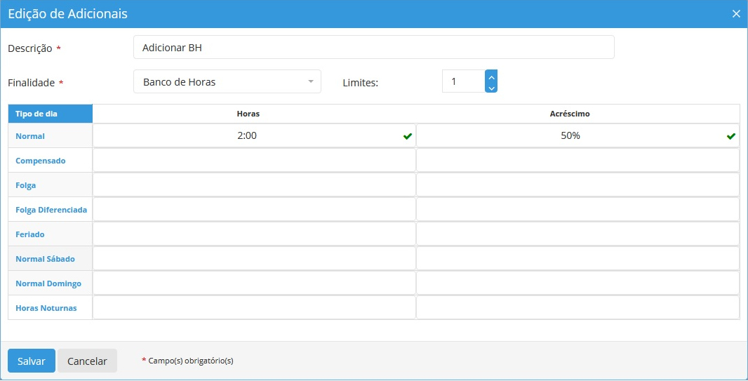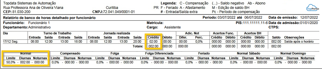 No exemplo a seguir, está configurado um adicional de 50%. Diferentemente do Banco Diário, neste tipo de banco, o valor do adicional não é somado às horas registradas, mantendo o total original para cada limite.