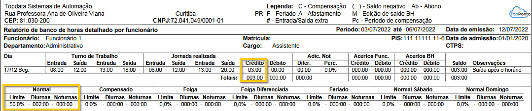 Neste dia, foram registradas 2 horas no Banco de Horas com acréscimo de 50%, totalizando 3:00 horas no relatório (2:00 + 50%), conforme ilustrado no exemplo a seguir: