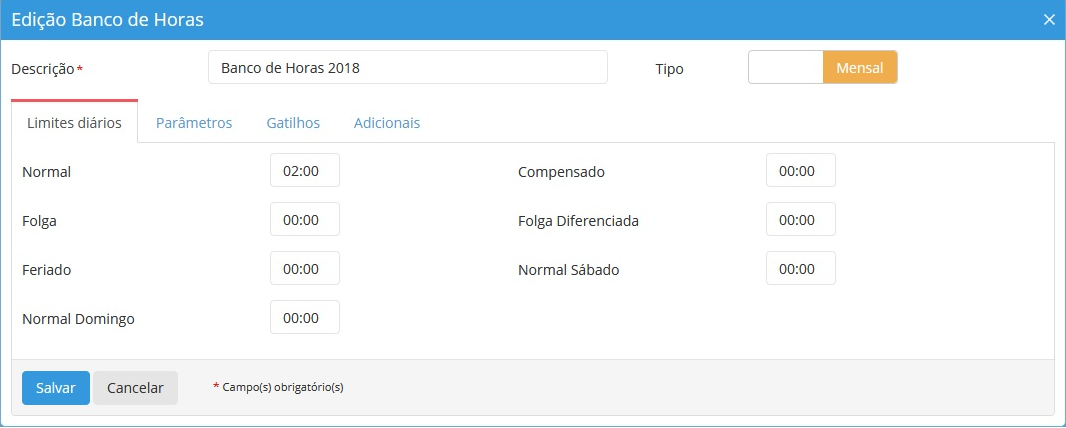 - No tipo Diário, os valores do Adicional são somados ao limite configurado.