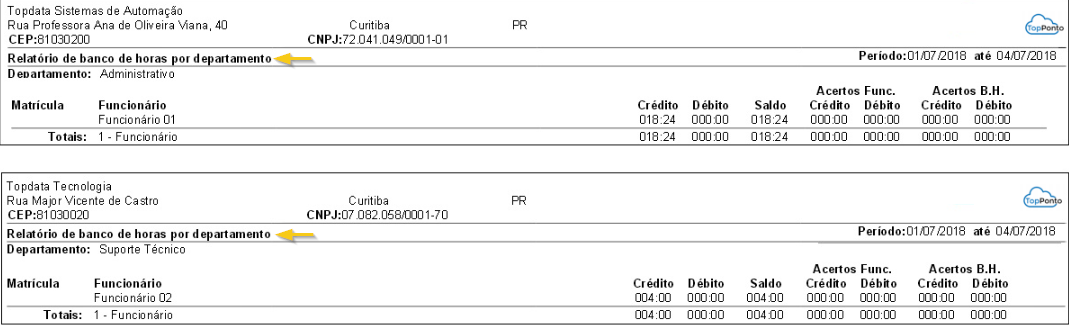 Apresenta em um único relatório todos os funcionários de um departamento específico, mostrando apenas os totais de horas calculados. - Resumido por empresa