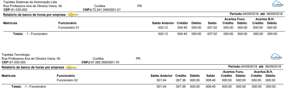 Exibe em um único relatório todos os funcionários de uma empresa, apresentando apenas os totais de horas calculados para cada funcionário. - Resumo de saldo por funcionário