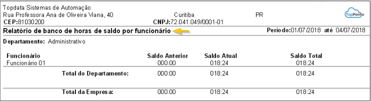 Este relatório apresenta todos os funcionários de uma determinada empresa, exibindo os totais calculados para cada colaborador durante o período selecionado. O saldo anterior informado corresponde ao acumulado até o dia anterior à data de início do período de emissão, permitindo acompanhar facilmente o histórico e o saldo atual do banco de horas