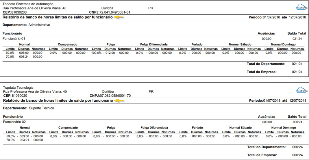 - Ao final do relatório, são apresentados os valores de horas acumuladas em cada limite configurado no banco de horas.