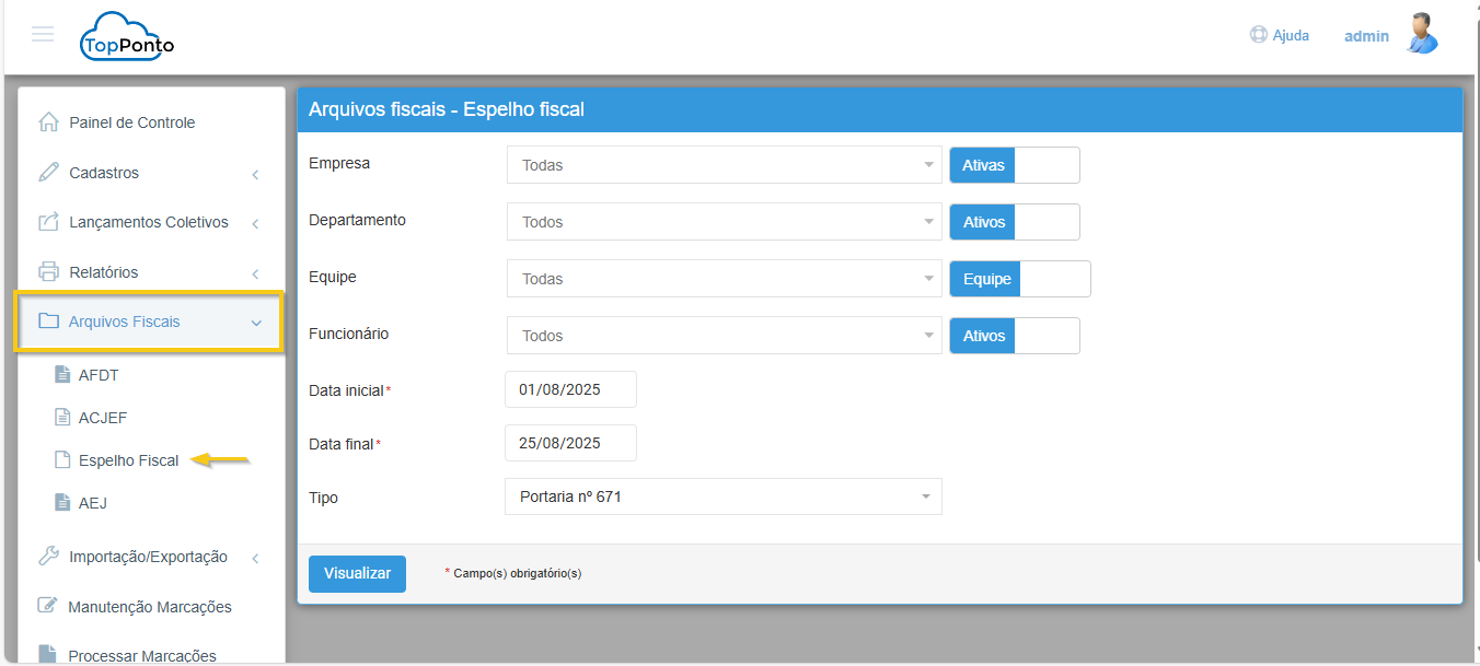 O Relatório Espelho Fiscal, que atende às exigências da Portaria 1510 e 671, não é acessado pelo menu Relatórios, mas sim pelo menu Arquivos Fiscais, conforme exemplo abaixo: