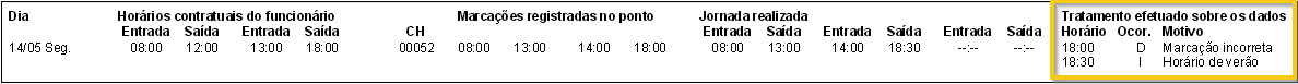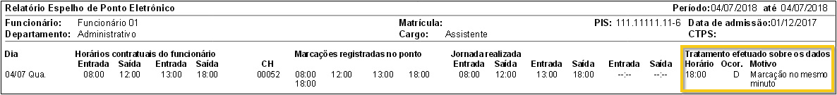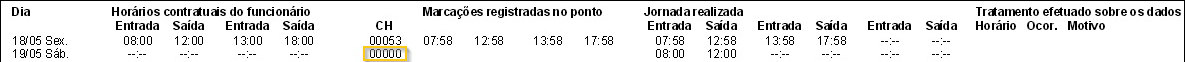 Se todas as marcações exibidas no Relatório Espelho forem originais, ou seja, não sofreram qualquer tratamento, elas serão apresentadas em uma única linha no relatório.