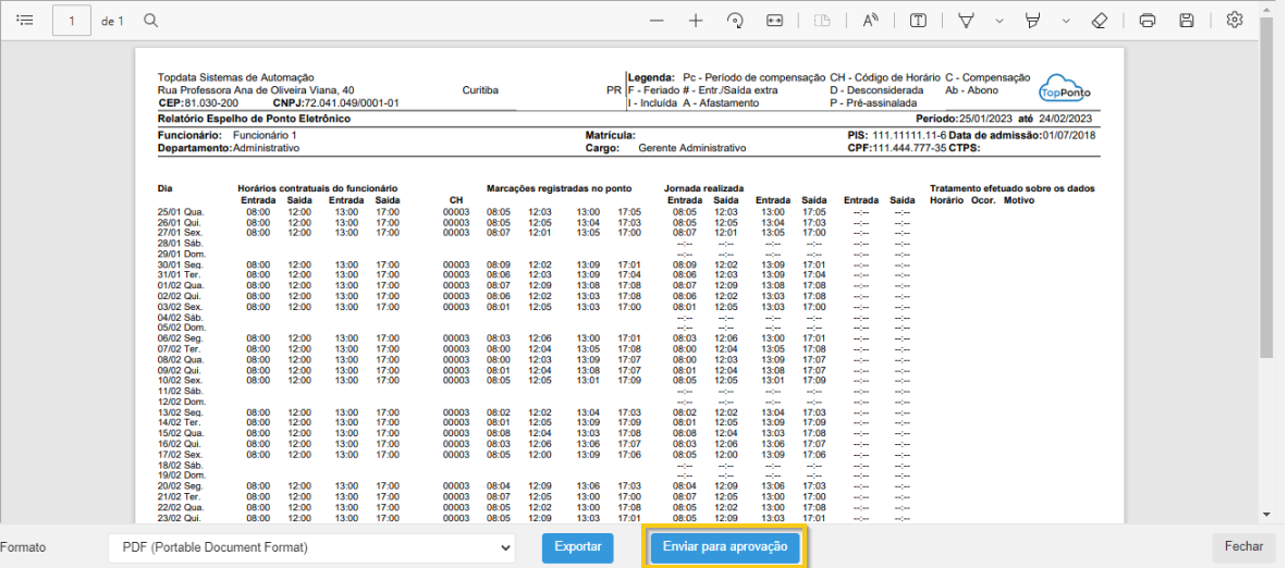 Após configurar o tipo de relatório como “Espelho”, será exibido o botão “Enviar para aprovação”.