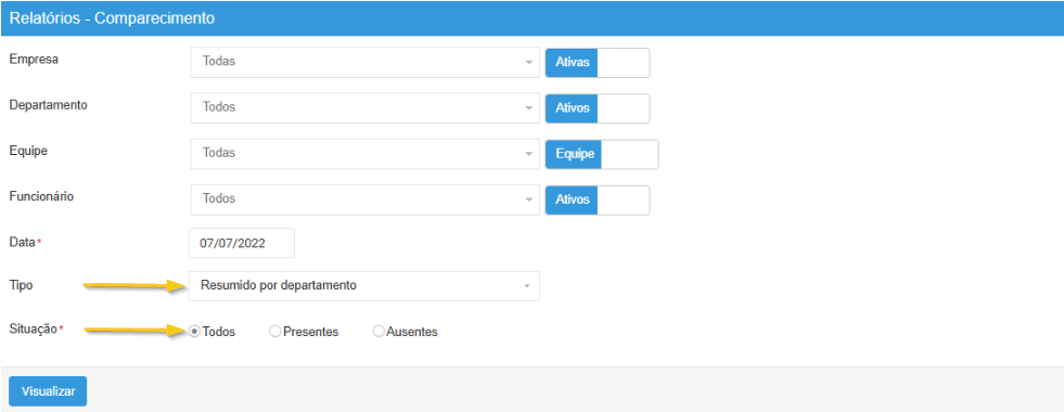 - Situação do funcionário: filtra por Todos, Presentes ou Ausentes, exibindo apenas os funcionários que atendam ao critério escolhido.
