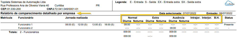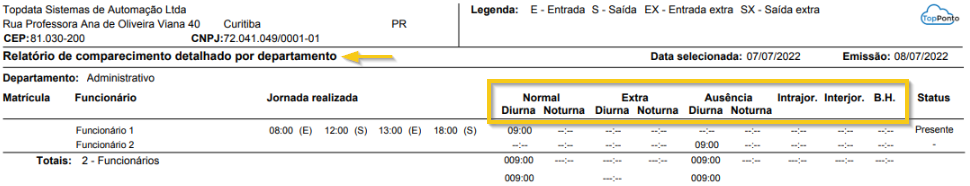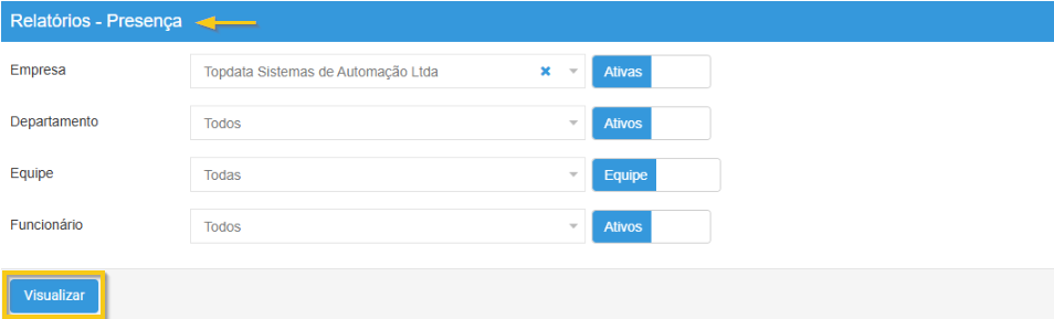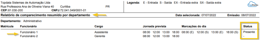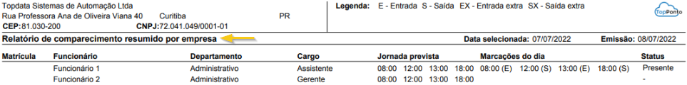 Com a opção “Presentes” selecionada, o relatório exibirá apenas os funcionários que estiveram presentes.
