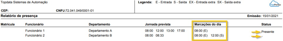 O Relatório de Presença apresenta a situação dos funcionários no dia de geração do relatório, indicando se estão presentes ou ausentes, com base no último registro de ponto.