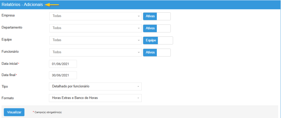 O relatório de adicionais exibe os adicionais de horas extras e do banco de horas realizados pelo funcionário dentro do período de emissão. As horas são apresentadas separadamente por limite de hora extra ou banco de horas.