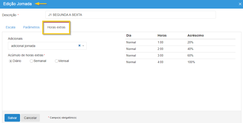 Para que o relatório exiba corretamente as informações de adicionais, é necessário acessar o cadastro de jornada e, na aba Horas Extras, selecionar o adicional correspondente, conforme demonstrado na tela a seguir.