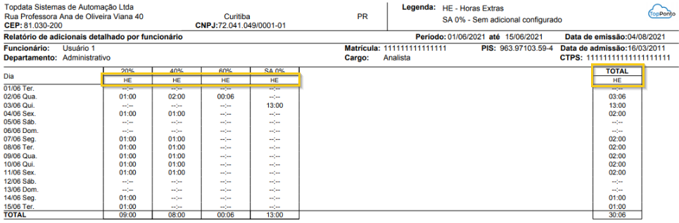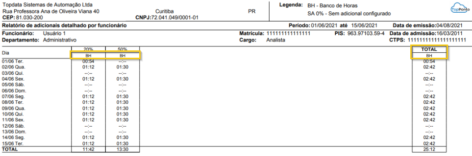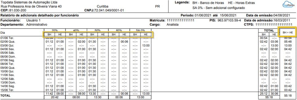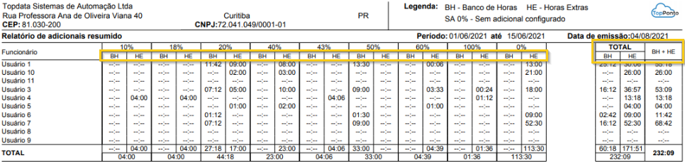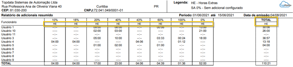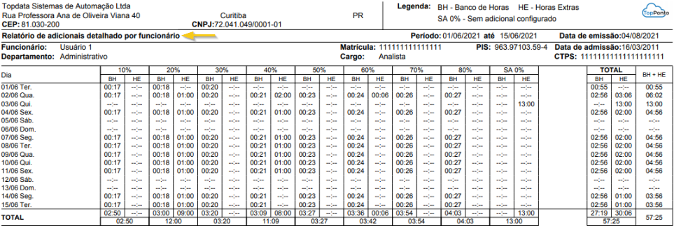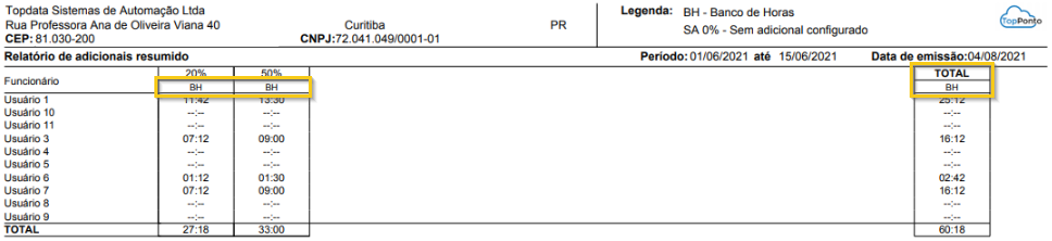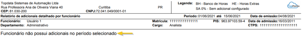 Caso o funcionário possua horas extras ou banco de horas sem limite configurado, o relatório será gerado conforme o exemplo anterior, pois se trata de um relatório de adicionais.