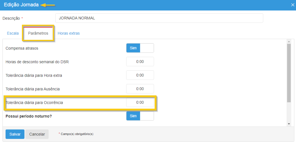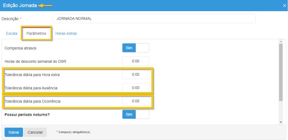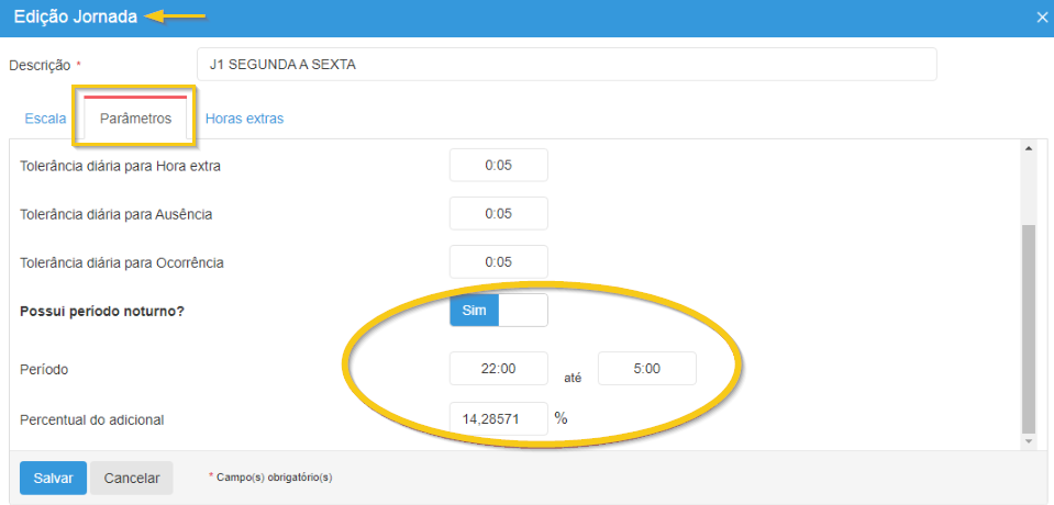 A configuração das Horas Noturnas de cada funcionário é realizada em Cadastro de Jornadas → Parâmetros.