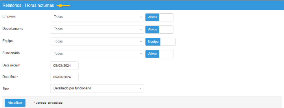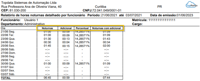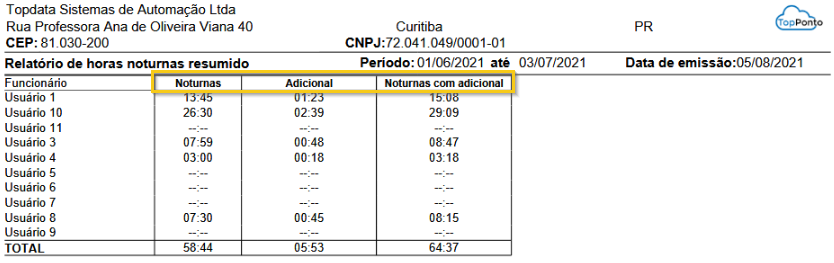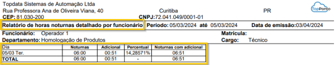 Ao emitir o Relatório de Horas Noturnas, os valores são apresentados da seguinte forma: