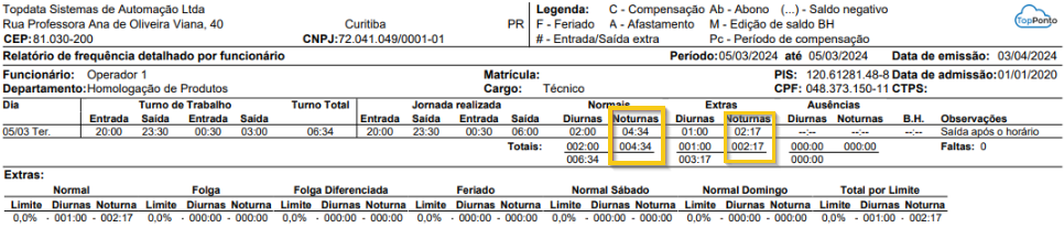 No Relatório de Frequência, é possível observar que nas colunas Normais Noturnas e Extras Noturnas os valores já estão acrescidos do percentual noturno.