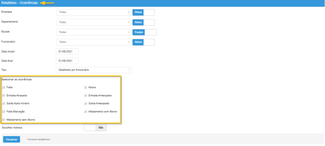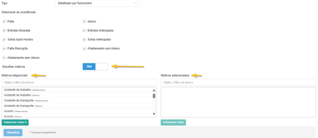 Para as ocorrências de Abono, Afastamento com abono e Afastamento sem abono, é possível filtrar os motivos que deseja visualizar no relatório. Para isso, basta habilitar a opção “Escolher motivos” e selecionar os itens desejados.