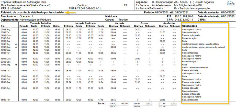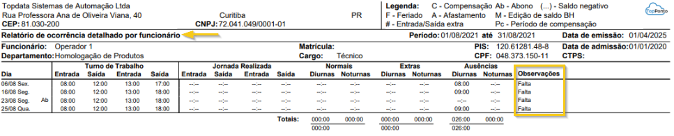 Abaixo temos um exemplo de relatório mensal de um funcionário com todos os tipos de ocorrências: