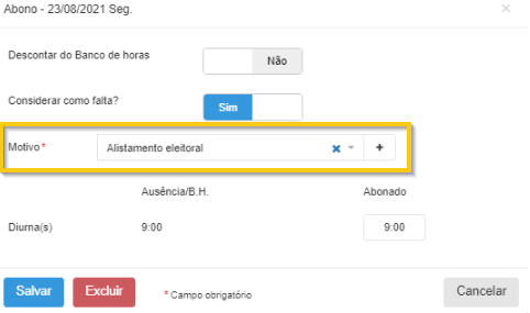 O campo Observações exibe os motivos dos eventos registrados no dia. Para que esses motivos sejam apresentados, é necessário definir os valores das ocorrências dentro do Cadastro de Jornada, na aba Parâmetros.