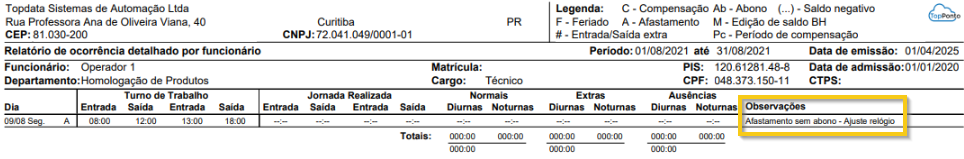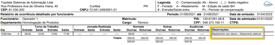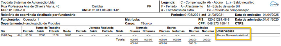 Ao gerar um relatório de Ocorrências do mesmo período selecionando apenas a flag “Abono“, será exibida a mesma data em que houve a falta, porém o relatório apresentará o motivo do abono na coluna de observações.