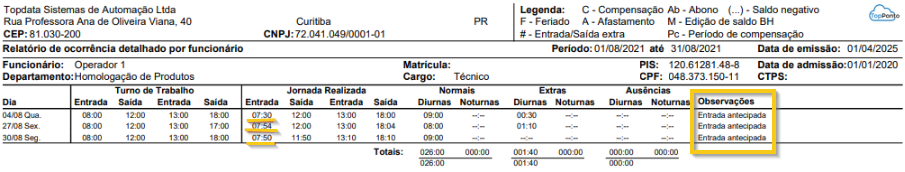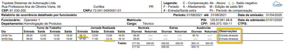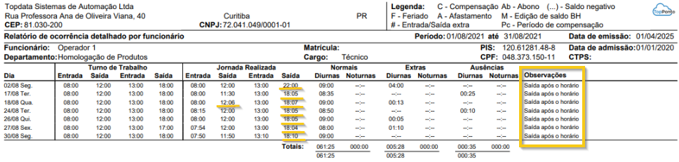 Relatório de frequência exibe uma saída atrasada. Ver campo “Observações”: