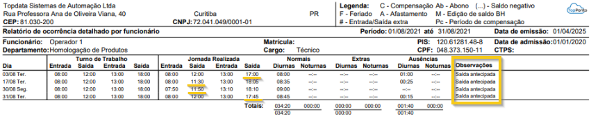 Ou seja, o conteúdo do campo “Observações” nos relatórios de Ocorrência, Frequência, Horas Extras e Banco de Horas depende diretamente da configuração definida em Cadastro de Jornada, no item Tolerância diária para Ocorrência.