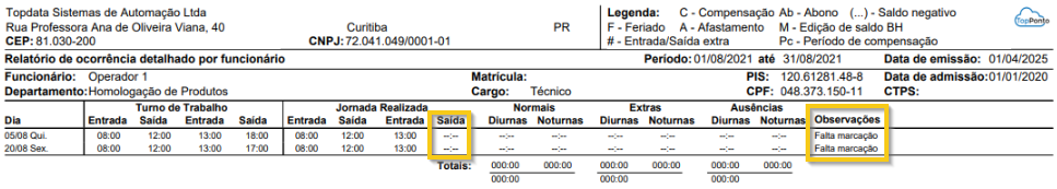 Para este item, o relatório será exibido apenas quando houver um número ímpar de marcações, ou seja, quando houver uma entrada sem a respectiva saída. Nessa situação, as colunas de horas normais, extras e ausências não apresentarão valores.