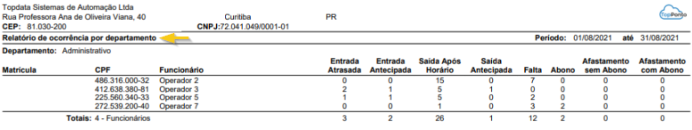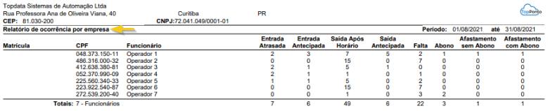 O relatório de ocorrências exibe os eventos detectados pelo TopPonto Web relacionados à jornada de cada funcionário, tais como faltas, entradas atrasadas, saídas após o horário, horas abonadas, afastamentos com ou sem abono e entradas ou saídas antecipadas. Ele pode ser filtrado por período, permitindo o acompanhamento diário da empresa e facilitando o fechamento do mês.