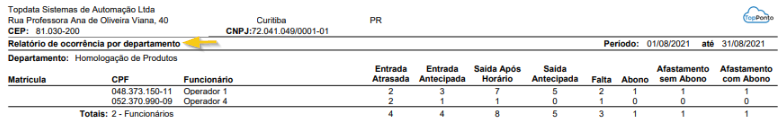 - Resumido por departamento: Agrupa os funcionários de um departamento, mostrando apenas os totais calculados de cada tipo de ocorrência. A opção “Falta marcação” não está disponível neste tipo.