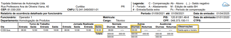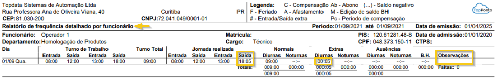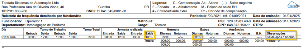 No exemplo abaixo, o Relatório de Frequência apresenta 5 minutos de hora extra, porém o campo Observações permanece em branco.