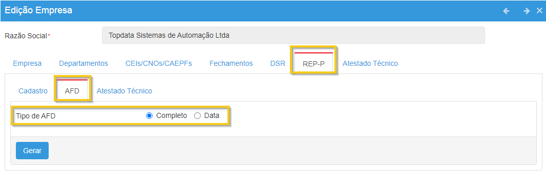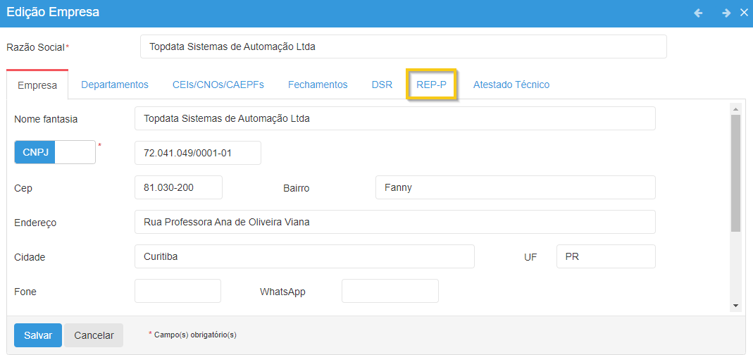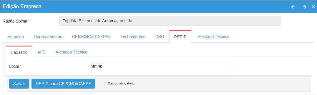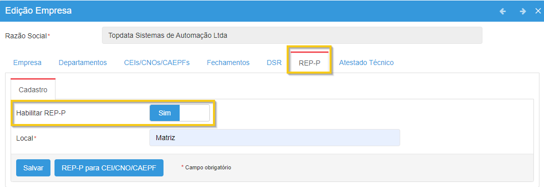 A ativação do REP-P no cadastro de empresa é requisito para o funcionamento do coletor de dados Inner Ponto 4, Leitor Facial ou aplicativo TopPonto.
