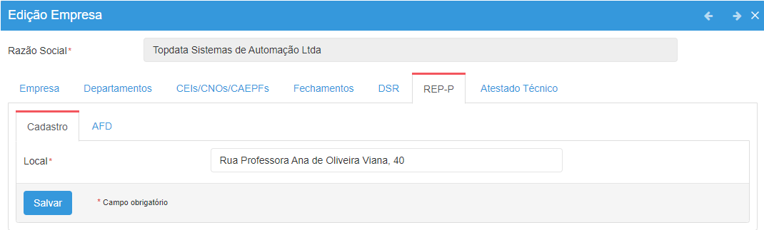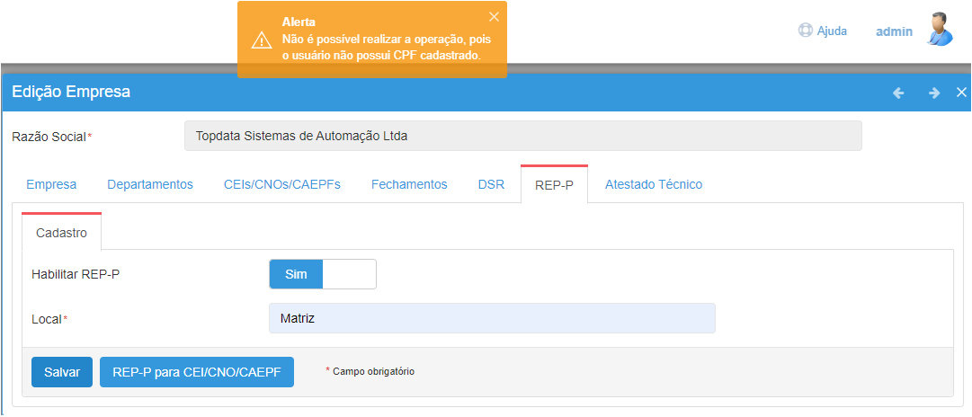Ao clicar em Salvar, será exibido um aviso contendo uma breve explicação sobre a funcionalidade do REP-P, informando que após habilitado não será mais possível desabilitar o uso, e que a empresa relacionada ao REP-P não poderá ser excluída.