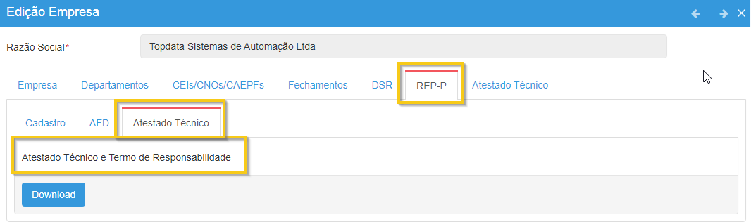 - Após a ativação do REP-P, o Atestado Técnico e Termo de Responsabilidade não é disponibilizado imediatamente para download.