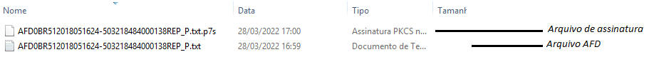 Com relação a assinatura digital do arquivo AFD a mesma é exibida com o texto “ASSINATURA_DIGITAL_EM_ARQUIVO_P7S”.