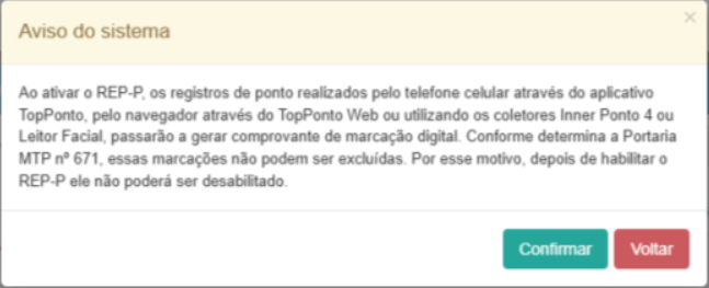 Ao ativar o REP-P, os registros de ponto realizados pelo telefone celular através do aplicativo TopPonto, pelo navegador através do TopPonto ou utilizando os coletores Inner Ponto 4 ou Leitor Facial, passarão a gerar comprovante de marcação digital. Conforme determina a Portaria MTP nº 671, essas marcações não podem ser excluídas. Por esse motivo, depois de habilitar o REP-P ele não poderá ser desabilitado.