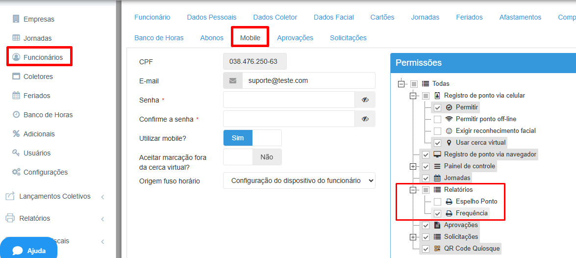 IMPORTANTE não confundir com a opção de relatórios que aparece na árvore de permissões na aba mobile dentro do cadastro do funcionário. Nessa opção você pode definir qual relatório o funcionário pode consultar no APP na opção relatórios a qualquer momento, não sendo utilizado para aprovações, mas apenas para conferência de seu ponto.