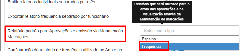 Para fazer a seleção acessar Cadastros>Configurações>Relatórios na opção “Relatório padrão para Aprovações e emissão via Manutenção Marcações” selecione o relatório que deseja. Normalmente para fechamento de ponto, aprovação e assinatura do funcionário, utiliza-se o relatório de frequência, que é o relatório que mostra os totais de extras, saldo de banco de horas e horas de ausências do período.
