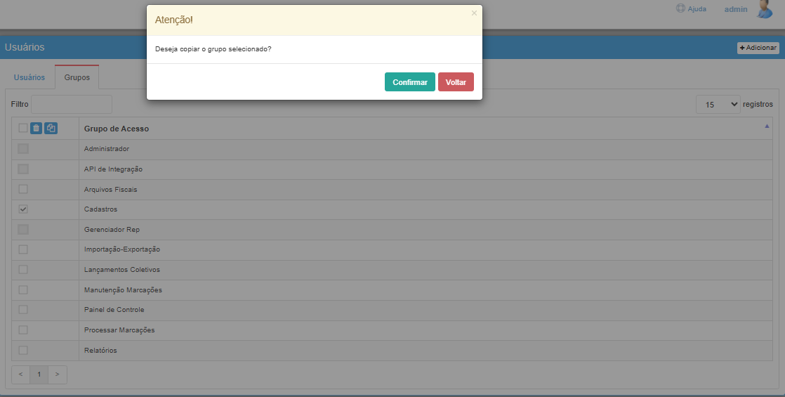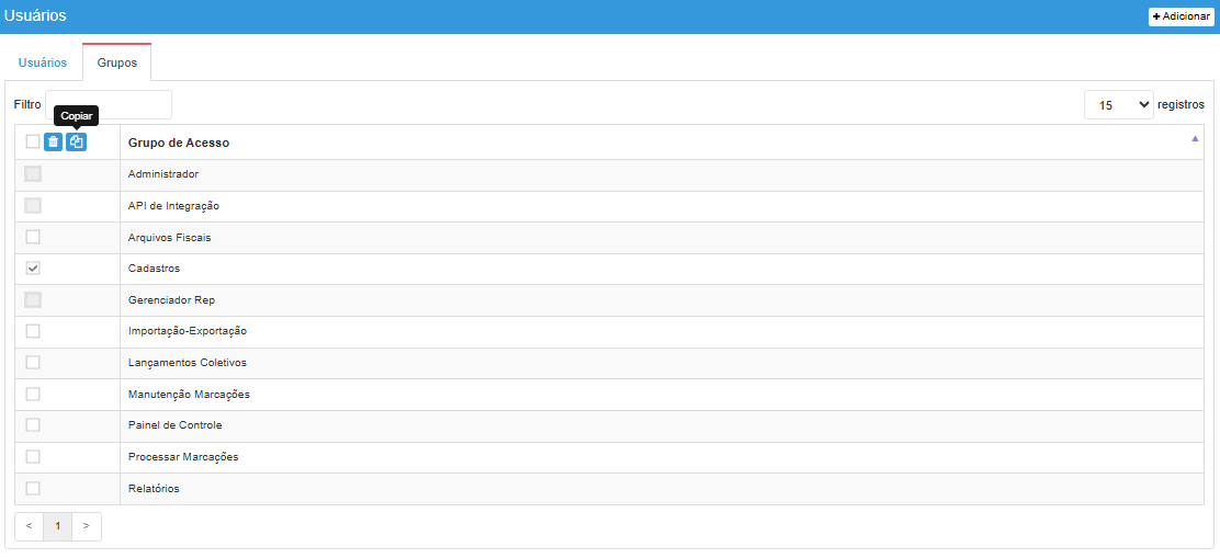 Para realizar a “Cópia” de uma grupo de acesso deve-se selecionar o item desejado e clicar na opção “Copiar” no canto esquerdo da tela.